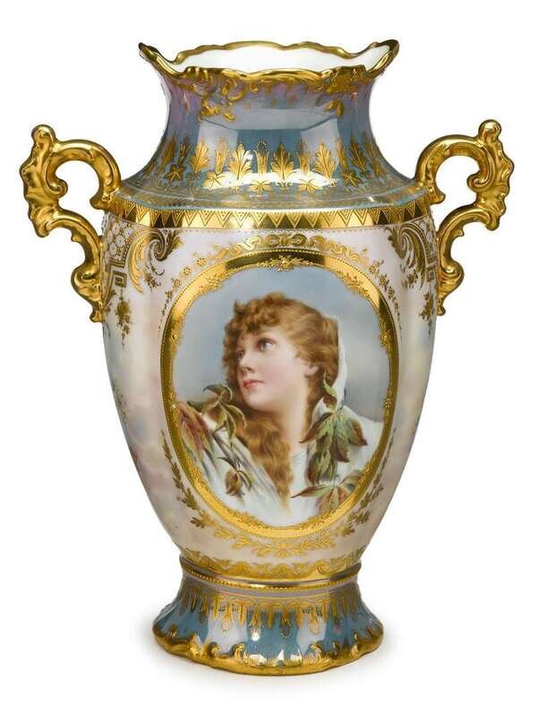 Lobed baluster form, the cavetto neck with shaped rim mounted with twin acanthus scroll handles, the body painted to show 'Daphne' to one side, the verso painted to show a maiden wearing a shawl and foliate swag.