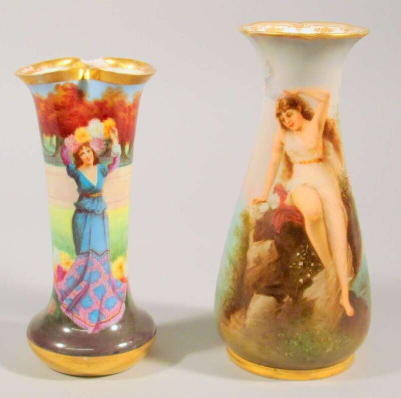 The first a Royal Vienna vase showing the Rhine maiden Lorelei seated upon a rock; the German vessel with pinched rim depicting a female figure holding a garland of flowers. (2).