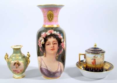 Comprising a baluster form urn painted to show a maiden in a forest landscape, a small lobed baluster form urn painted to show Daphne in a cartouche upon a green and gilt ground, and a cobalt cylindrical chocolate pot and underdish painted to show classical figures in a landscape. All with blue beehive mark to underside. (3).