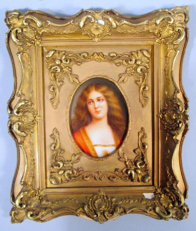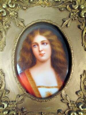 Painted to show a beautiful maiden with long flowing hair, impressed marks verso, within giltwood frame.