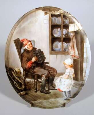 The oval plaque painted to show an old man seated in an interior and playing an accordian while a young girl dances in front of him. Signed lower right 'Florence S Smith 1900'.