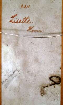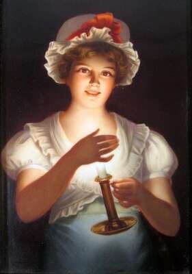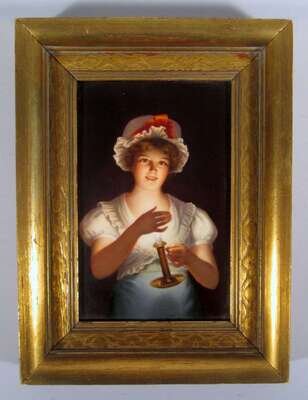 The rectangular plaque painted to show a young girl holding a lit candle, within giltwood frame. The reverse titled "Lisette Kom" and stamped "Germany".