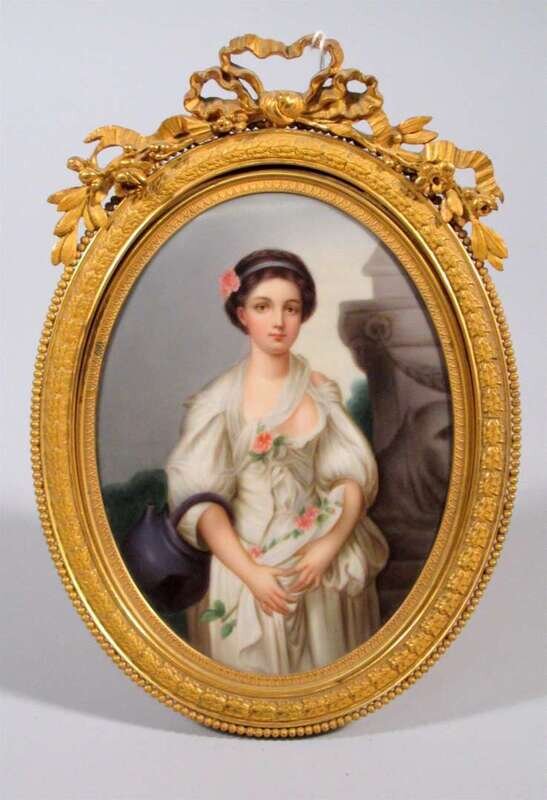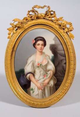 The oval plaque painted to show a maiden in flowing white robes adorned with pink flowers, in an architectural landscape, within foliate and ribbon gilt bronze cast frame.