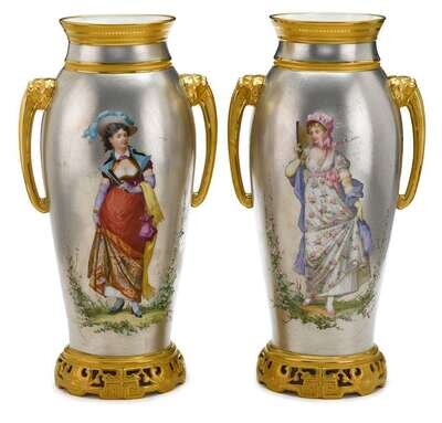 Pair of Paris porcelain platinum ground two-handled vases circa 1875, signed a. deligny