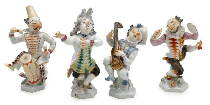 Comprising a hunchback drummer, impressed mark A1267, incised number 137; a singer, impressed mark A1263, incised number 142; a guitar player, impressed mark A1264 incised number 43; and a cymbals player, impressed number A1266, incised number 66, all with underglaze blue crossed swords marks to undersides.