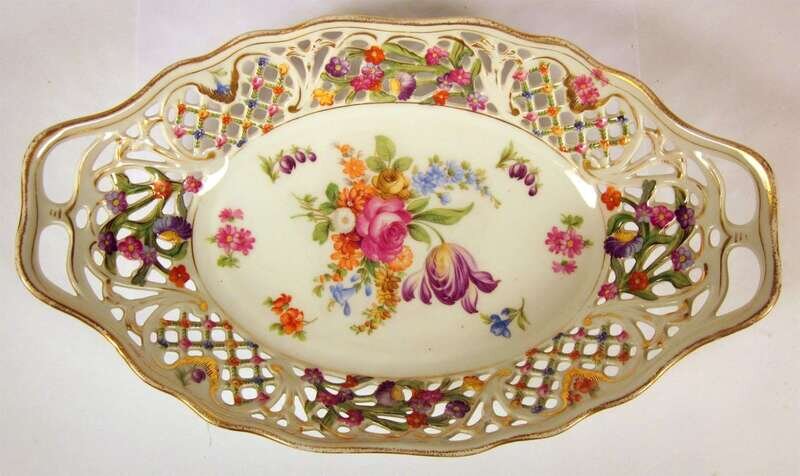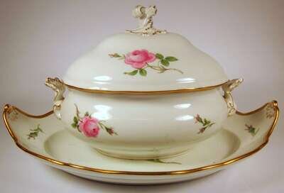 Typical form, painted to show pink roses, with gilt foliate scroll handles and finial, above deep oval undertray; together with a similarly decorated Dresden porcelain pierced dish. (3).