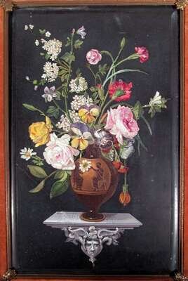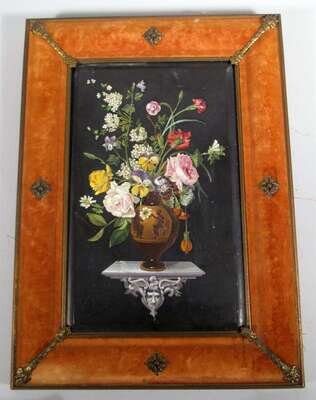 The bevelled black marble plaque intricately inlaid with varicolored stone tesserae to show a floral bouquet within an antique Greek vase, sat upon a neoclassical wall bracket, within a gilt metal and velvet lined frame.