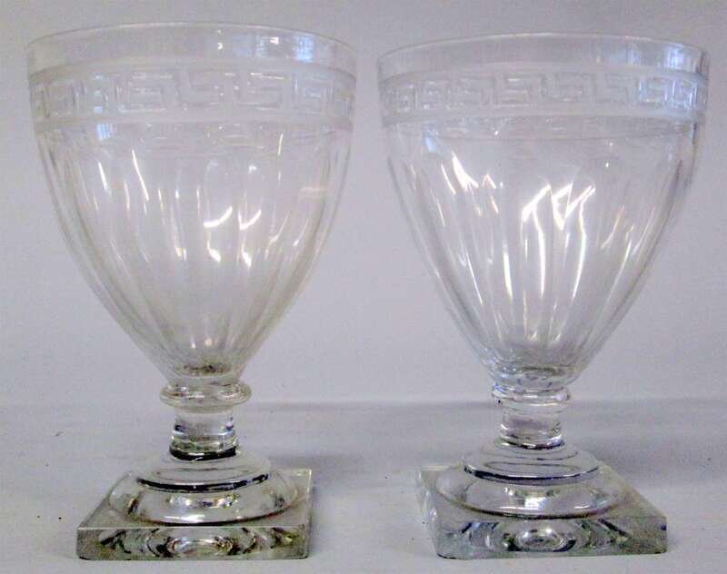 The fluted bowl with etched Greek key around rim, above circular foot on square base.
