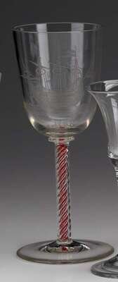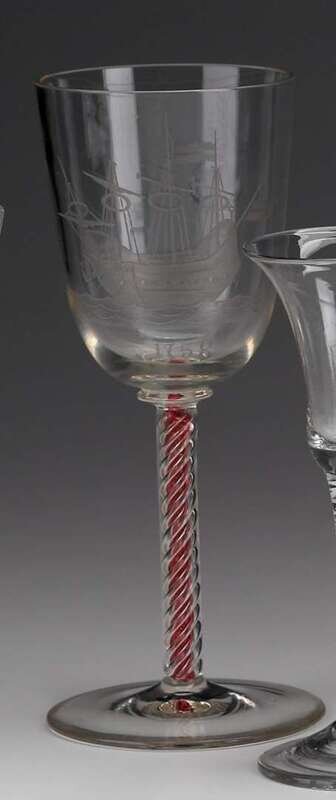 The bell form bowl displaying a four-masted ship above the date 1758 on twisted clear and cranberry stem.