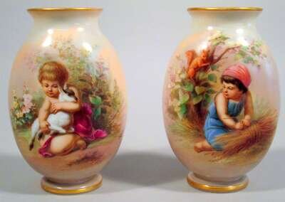 Flattened ovoid form, each painted with a young child, one with a squirrel watching a youth tie a bundle of wheat, the other of a toddler holding a goat, signed lower left, the underside stamped with the obverse and reverse of the medals for the 1873 Vienna Weltausstellung and the 1878 Paris Exposition Universelle.