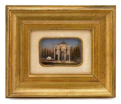 Reverse painted in layers to show villagers in front of the Stiegestor in Munich, Germany. Framed and matted.