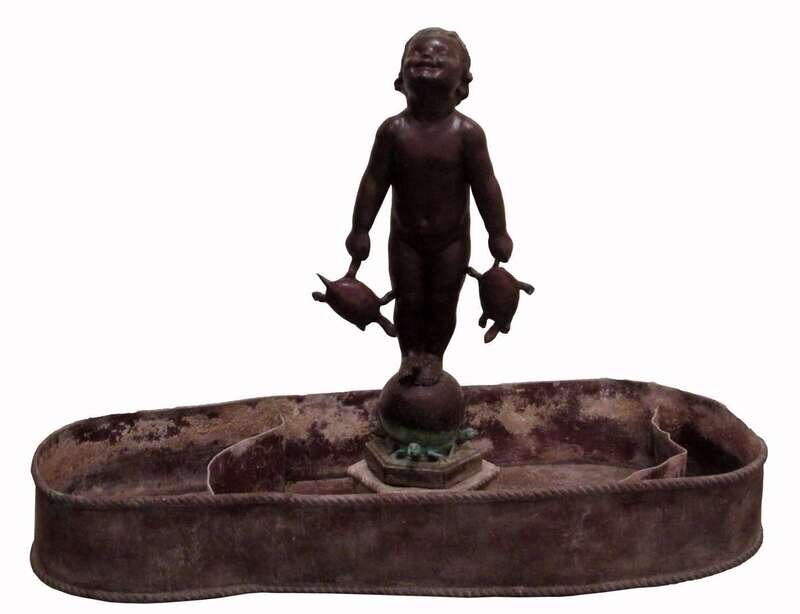 Bronze with verdigris patina, the nude youth holding a turtle in each hand, set within shallow fountain base, inscribed "E. Parsons, Roman Bronze Works."