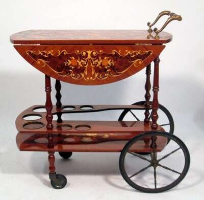 Italian burl walnut and fruitwood marquetry inlaid serving cart mid 20th century
