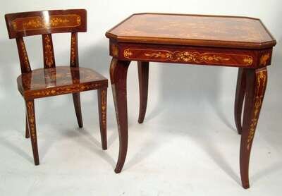 The marquetry inlaid square top with canted corners and underside inlaid for backgammon, lifting off to reveal a further lift off top inlaid for chess and with baize on the underside, llifting off to reveal two sliding sections inlaid for roulette, sliding open to reveal roulette wheel, chess peices, games token etc., raised on slender cabriole legs; together with three conforming marquetry inlaid chairs.