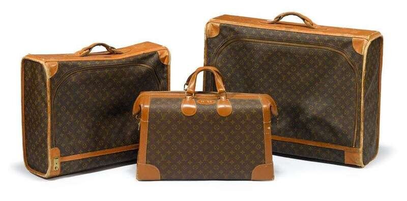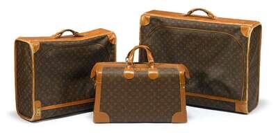 Comprising a large soft suitcase; another smaller soft suitcase, both with Saks Fifth Avenue retailer's label; and a soft gentleman's shoe bag with eight corduroy lined compartments, monogrammed "SM".