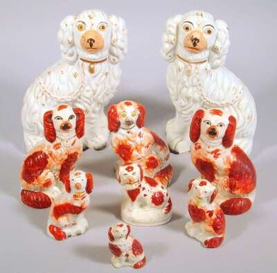 Each modelled in a seated position, including a pair of white spaniels and six other red and white spaniels of various sizes.