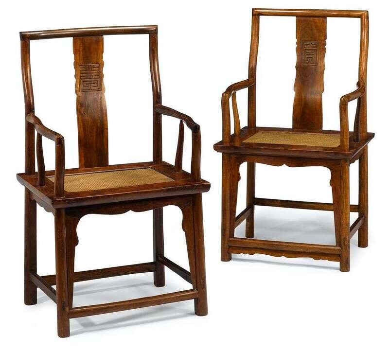 Shaped backsplat carved with 'shou' symbol, outcurved arms supported on tapering posts supported on a rectangular frame enclosing mat seat, the legs are joined by bracket shaped aprons and step stretchers.