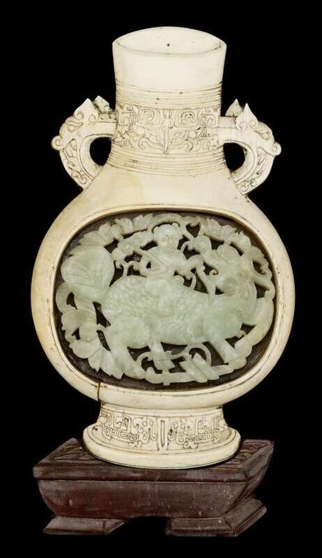 Ivory sconce carved in hu vase form with jade insert depicting male figure upon a mythical beast.