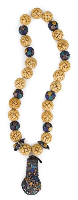 The necklace composed of ivory and enameled silver spheres; with floral-accented enameled silver pendant.