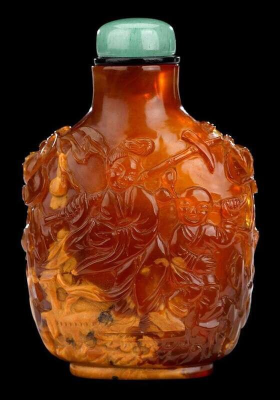 Rectangular bottle with round edges, fully carved to exterior with a lady and attendent in a garden landscape, raised on footring; amber of a deep honey tone with grain inclusions near base.