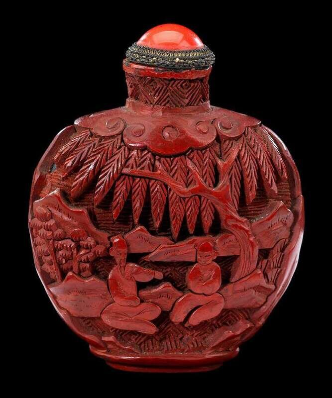 Of flattened shape with flat lip and protruding base, carved in deep relief depicting scene of scholar and attendant in a mountainous landscape.