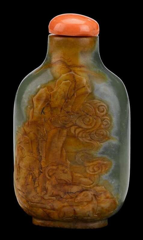Good Chinese yellowish-celadon and brown skin jade snuff bottle master of the rocks school, 1750-1850