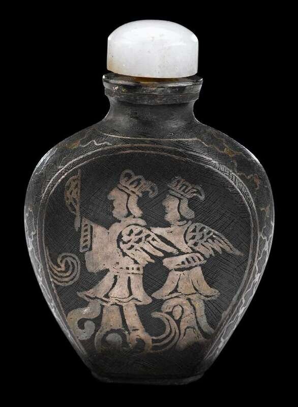 The spade-form bottle decorated with mythological beings and geometric borders over a cross-hatch ground.