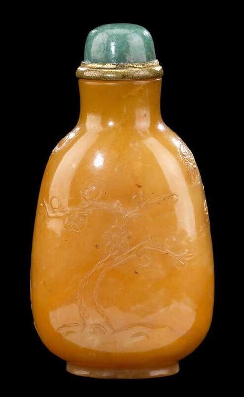 Of pear form; incised with prunus tree, chrysanthemum blossom, birds and butterflies; stone of light honey tone.