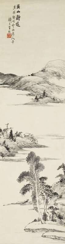 Hanging scroll; ink and wash on paper. Signed Tiefu with one artist seal: Xiao Junxian, depicting the tranquility of the brook and mountain scene. L: 54 3/4 inches x 12 1/2 inches