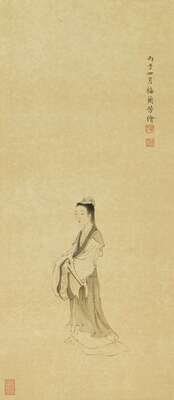 Hanging scroll, ink and wash on silk, signed and dated with seals reading Lan Fong, Zhi Yu Xuan and Mei Wan Hua. Sight H: 29 inches W: 12 inches