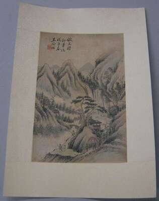 Album leaf, ink and color on paper; artist signature and sealmark, in the style of Wang Daizhao. L: 10 1/4 inches x W: 6 3/4 inches