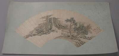Fan painting, ink and color on paper, inscribed. H: 9 1/2 inches x L: 20 1/2 inches