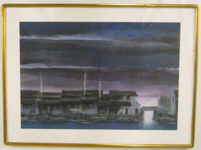 Watercolor on rice paper; mat, framed and behind glass; depicting a lakeside village in the purple mist of dusk. H: 26 inches x W: 38 inches