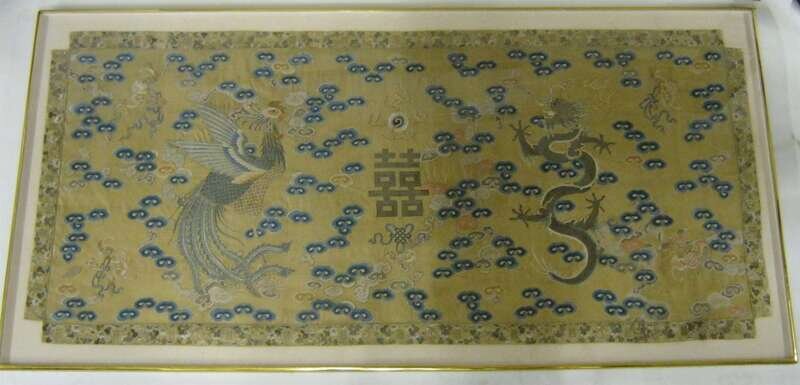 Embroidered to show dragon, phoenix contesting a flaming pearl, surrounded by fu bats among scrolling clouds.