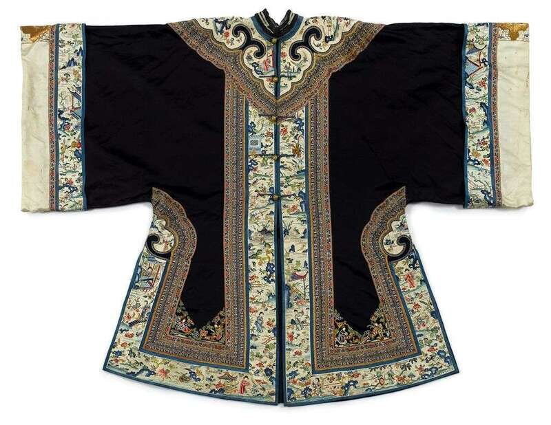 Collar and hem elaborately embroidered with figures and landscape scenes; robe of deep indigo silk.