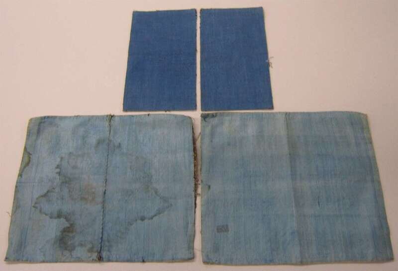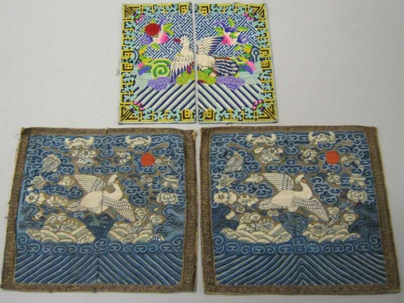 Front and back badges stitched and colored to show the white goose indicating fourth rank above roiling waves and a lishui band and among auspicious symbols; together with a single embroidered badge featuring the fifth-rank silver pheasant.