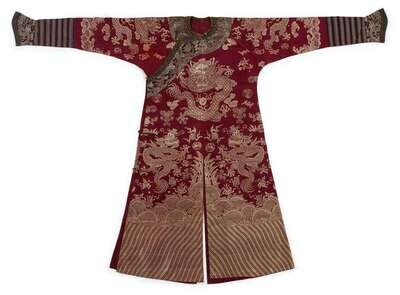 The robe with nine five clawed dragons amidst ruyi clouds and auspicious emblems above lishui band with horseshoe cuffs.