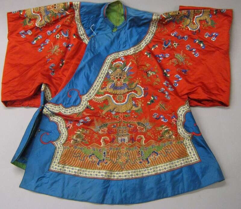 The red ground garment embroidered and adorned to show dragons chasing flaming pearls; trimmed in blue satin.