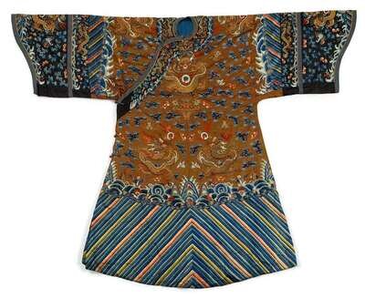 The brown ground robe embroidered with dragons pursuing flaming pearls among clouds and auspicious objects and animals; over a wide lishui band and with gilt bronze frogs.