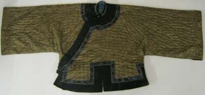 The thickly padded coat of dark khaki hue with black trim containing blue and turquoise butterflies with floral patterns along the hems, the lining of light blue color.