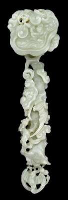 Typical sinuous fungus form, the detail carved head showing qilong and smaller fungus, the handle carved in open work to show fu bats and coiled qilong; terminating in a crescent fu bat.