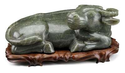 Well carved in a recumbent position with legs tucked beneath the full, rounded body and tail at one side, the head turned inquisitively toward the viewer with short ridged horns above the well-hollowed ears.