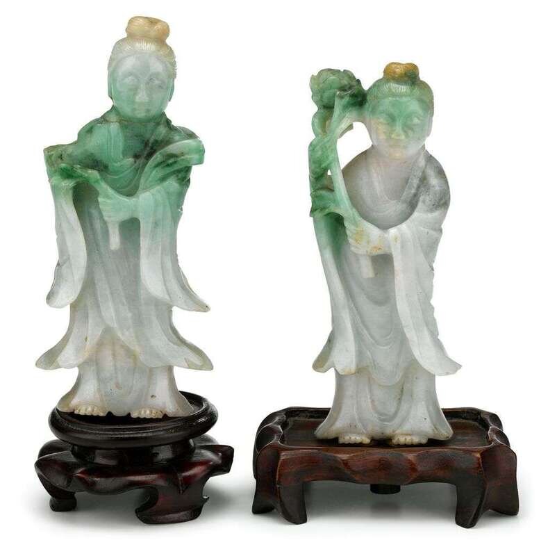 The standing figures dressed in flowing robes, one holding a flower and the other a branch.