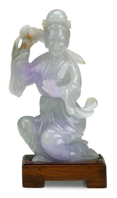 The kneeling beauty holds a cup in one hand and a sword behind her back; jade of pale lavender and green hue.