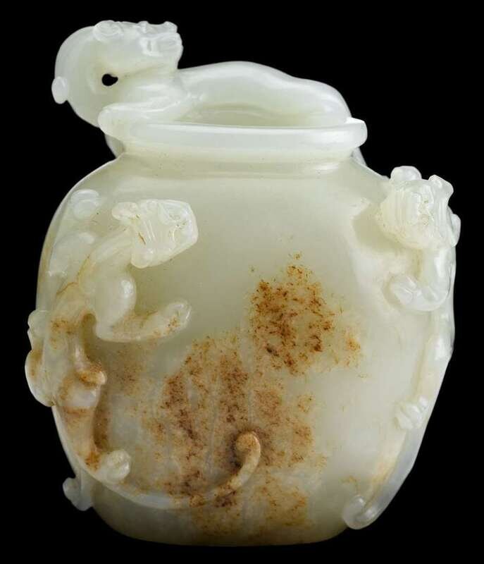 The oval baluster vase carved with two climbing qilong beasts, brown skin verso.
