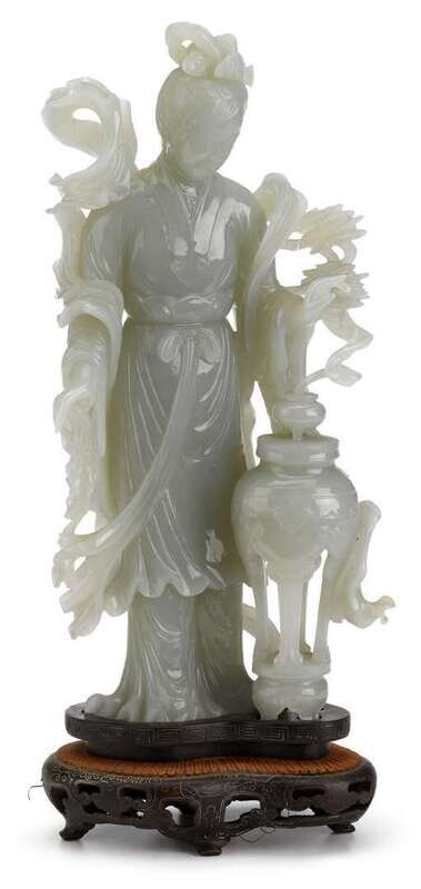 The elegant beauty dressed in flowing robes and billowing sashes stands before an incense burning tripod raised on a flower stand.