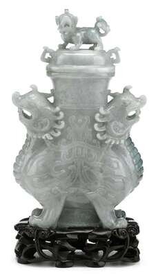 Carved in the form of conjoined fu beasts and with cover surmounted by standing fu lion; stone of bluish celadon color.