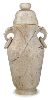 The high-shouldered slender vase tapering to waisted footring; delicately carved to body with stylized leaf blades incorporating archaic motifs, the neck applied with double dragon mask handles supporting loose rings, surmounted by a conforming domed cover; the stone of an opaque creamy white hue with grey and black inclusions.