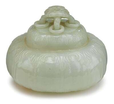 Carved jade Mughal-style covered pot of compressed globular form; carved from semi-translucent jade with foliate detail to domed cover and ornate floral carving with small russet inclusion under base.
