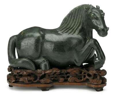 The horse carved with three legs tucked under the body and the right foreleg extended as if ready to rise; the jade of a deep green color with speckles of black.